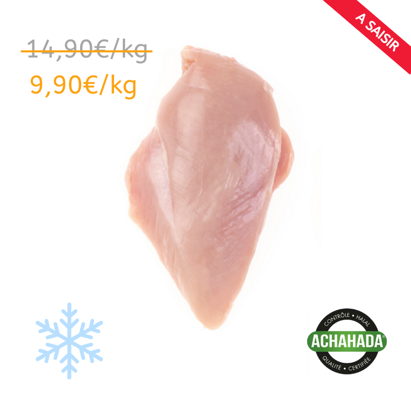 Filet de Poulet Halal certifié par ACHAHADA. Filet vendu en sachet IQF de 2,5kg.